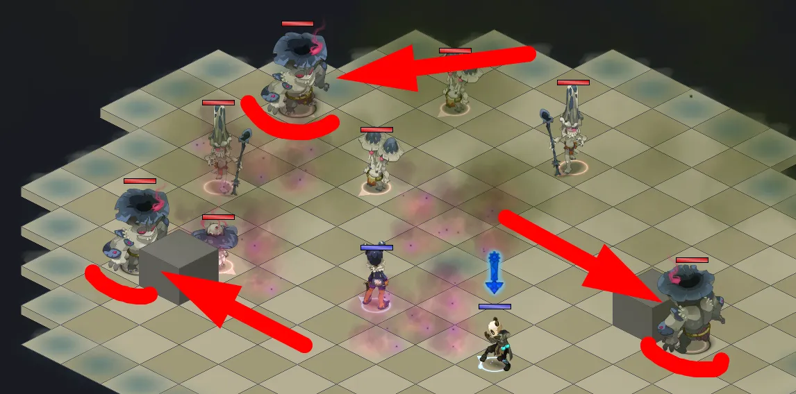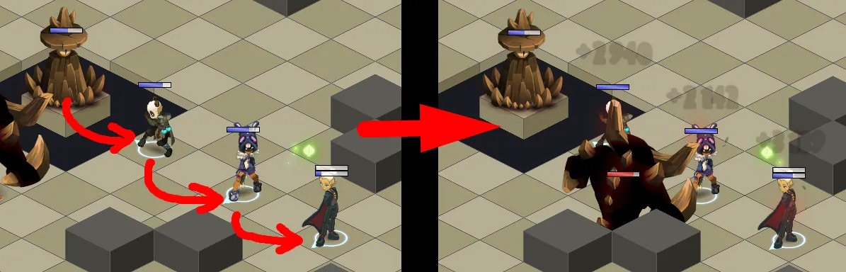 - Pour débloquer l’invulnérabilité (jusqu’à la phase 2), il faut tuer son invocation (qu’il va invoquer dès le premier tour) à moins de 3 PO de lui puis ensuite vous pourrez lui infliger des dégâts : Prévoyez des bons placeurs dans votre équipe pour ramener l’invocation du boss à moins de 4PO de lui (l’invocation peut parfois courir n’importe où et beaucoup s’éloigner du boss)