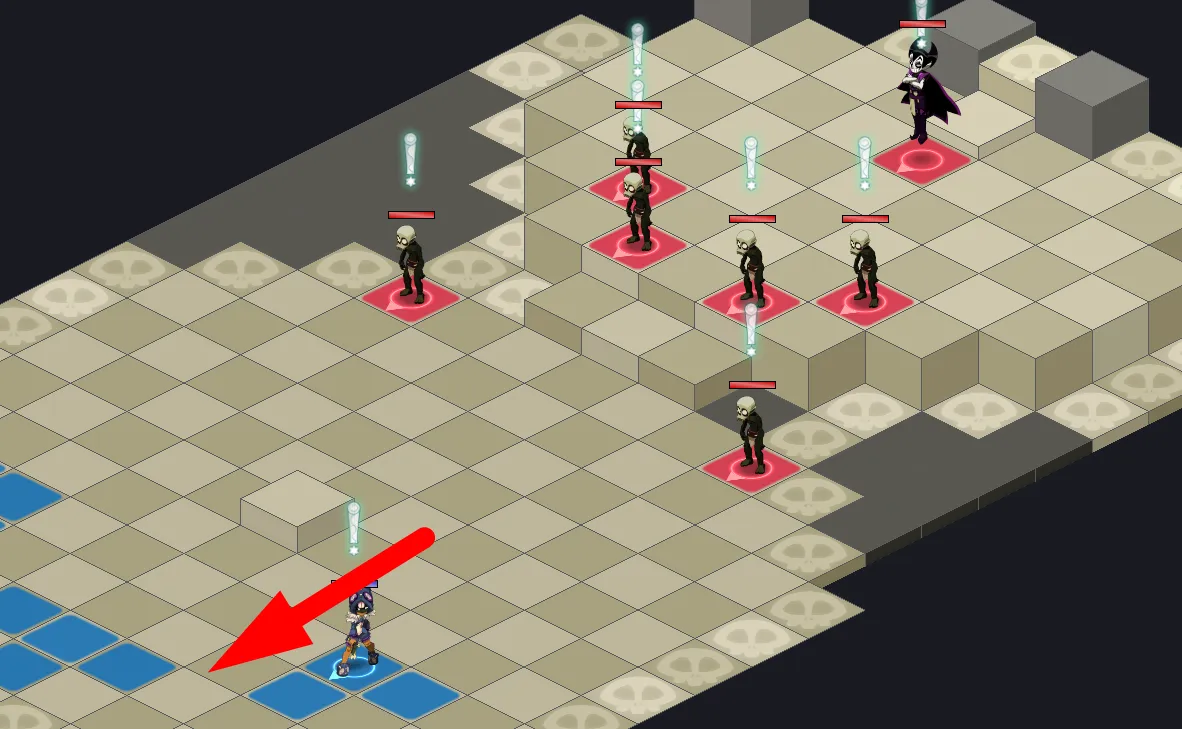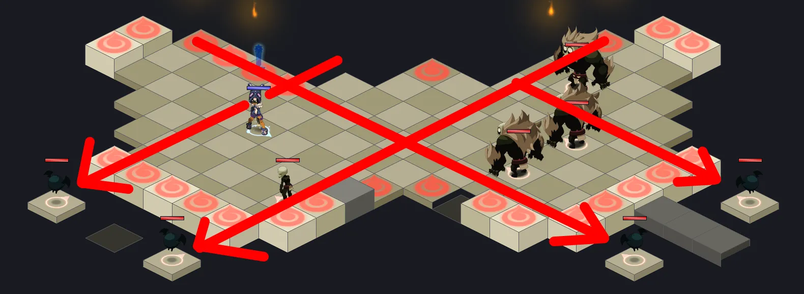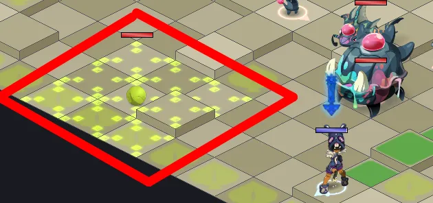 Le boss tape en zone et pousse de 3 cases en ligne : restez toujours à 4 cases minimum d’une bordure de map pour éviter de mourir sur une poussée