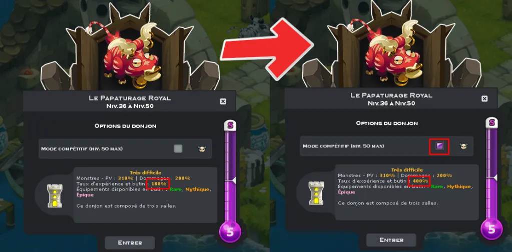 Un Drop fortement augmenté dans les donjons : En cochant le « mode compétitif » des différents donjons du jeu (à l’entrée), vous signifiez au jeu que vous souhaitez affronter le donjon en ayant le level du donjon. Dans ce cas là, et en augmentant la difficulté du donjon à plus de Stasis 3, vous allez profiter de bonus de drop conséquent extrêmement intéressant. Dans l’exemple ci dessous, on peut observer qu’affronter le donjon Moogr (en difficulté Stasis 5) en étant lvl 51 ou + nous donnera 188% de bonus drop contre 400% en compétitif lvl 50 ! A vous ensuite d’ajuster votre meilleur ratio entre le temps que vous mettez à terminer le donjon avec votre stuff « normal » et votre stuff lvl 50 !