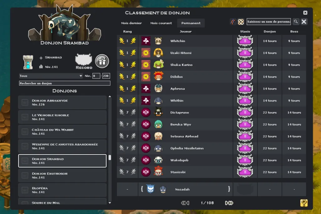 - L’inscription dans les Ladders PVM du jeu : Chaque donjon effectué en compétitif est « inscrit » dans les menus du jeu et tout le monde peut y avoir accès. Vous pouvez ainsi voir qui a réussi les donjons, avec quelles compositions ils y sont arrivé, à quelle difficulté ils ont réussi et en combien de tours ils ont réussi leur exploit. Un indispensable pour les joueurs qui veulent prouver leur valeur et marquer Wakfu de leur passage ! Sur l’image ci-dessous, il est donc possible de voir que le record du Donjon Srambad, de lvl 141, a été réussi au mieux par une équipe panda/ouginak/sadida/iop/sram/xelor, en difficulté 8 et en 14 tours pour le donjon. A vous de marquer l’histoire en essayant de faire mieux !