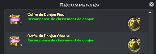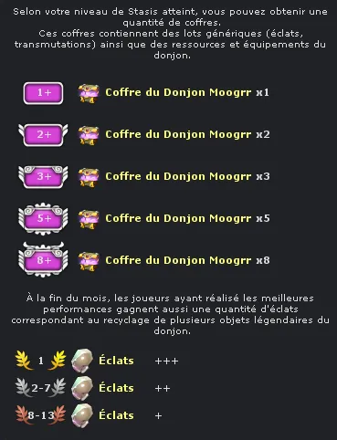 - Une récompense mensuelle est distribuée à chaque début de mois selon chaque donjon « compétitif » terminé durant les 30 jours précédents : Si vous avez terminé 8 donjons en compétitif avant la fin du mois, vous recevrez 8 récompenses exclusives au début du mois. Chaque récompense est lié au donjon en question et vous donnera des objets du donjon en question supplémentaire ainsi qu’un grand nombre d’éclats, très utile à l’enchantement ! Vous obtenez 1 coffre de donjon pour chaque difficulté de Stasis effectué. Dans l’exemple ci dessous, j’ai réussi le donjon Piou en compétitif modulé lvl 35 à la difficulté Stasis 3 et un donjon Chacha en compétitif modulé lvl 20 à la difficulté Stasis 8. Ce qui me donne donc 3 coffres Piou et 8 coffres Chacha.
