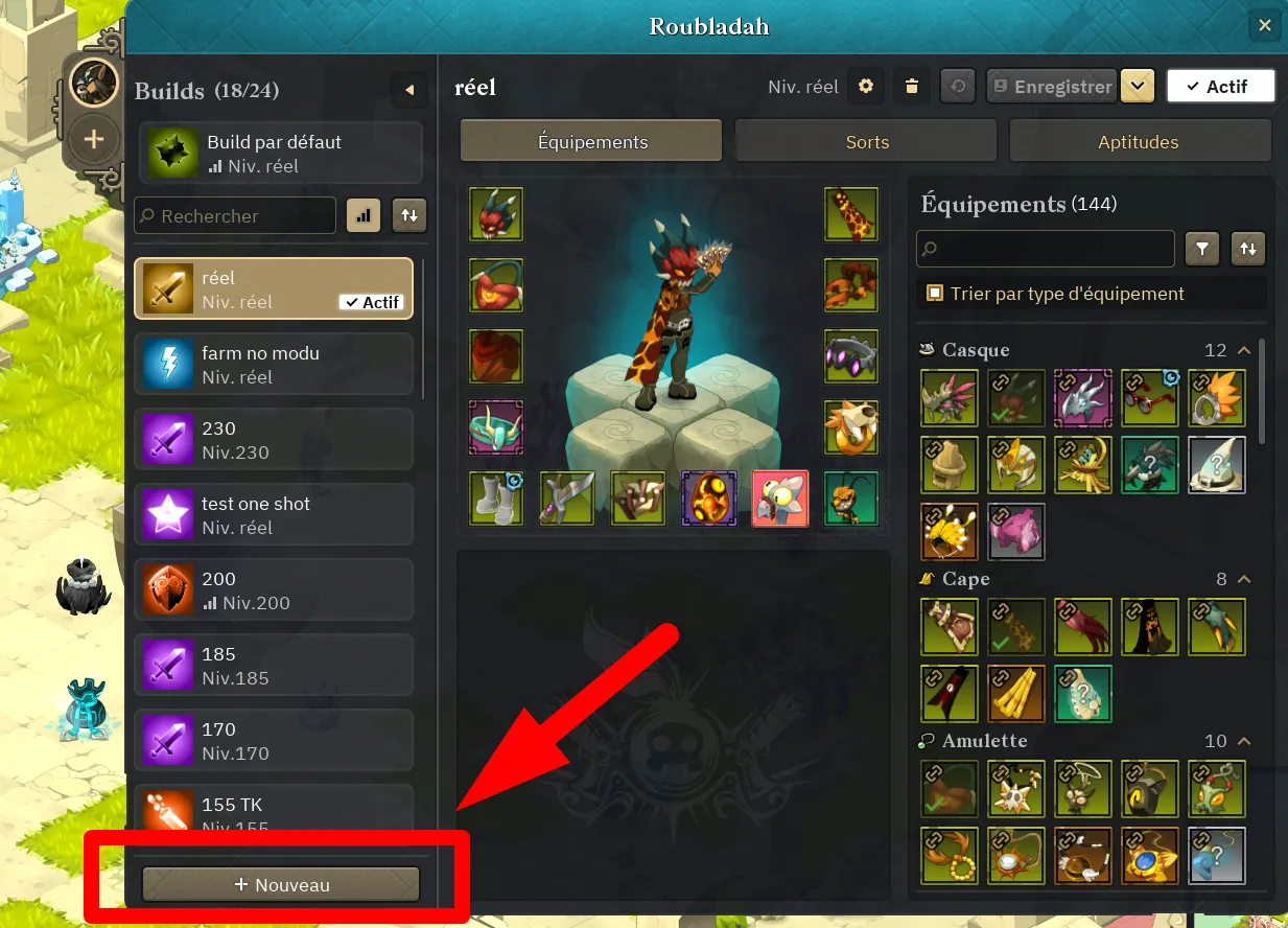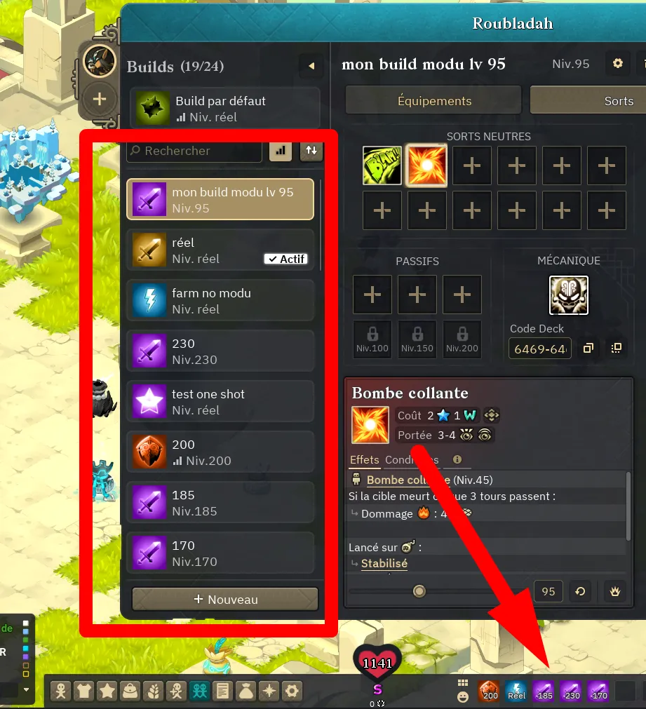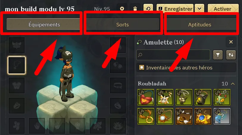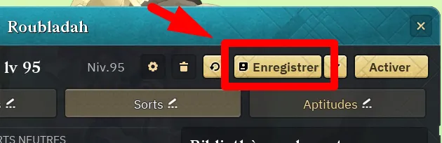 Vous retrouverez facilement tous vos builds ici ainsi que la possibilité de les faire glisser dans vos barres d’objets ! (il faudra seulement penser à cliquer sur “activer”)