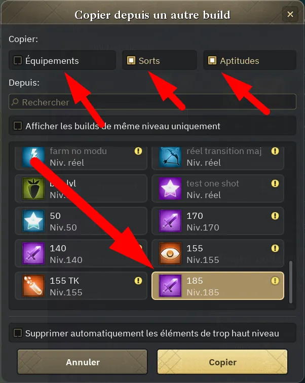 N’hésitez pas à utiliser l’option “copier depuis un autre build” qui vous fera gagner beaucoup de temps si vous avez déja un build modulé d’un lvl assez proche